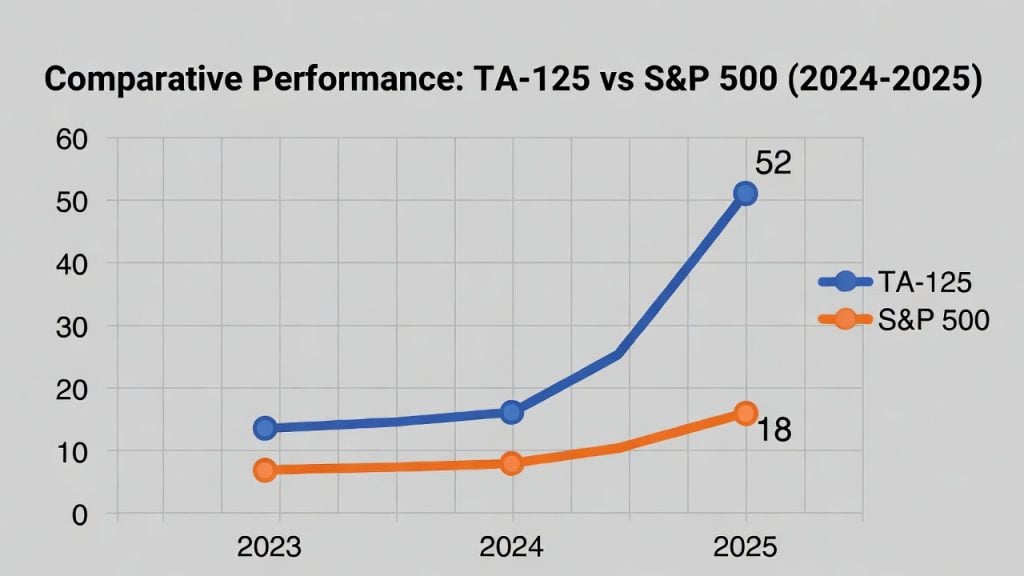 הבורסה הישראלית בכחול, לעומת מדד S&P 500 האמריקאי המדשדש. מי שהקשיב ל’כספת’ – הרוויח את הזינוק בשנת 2025.